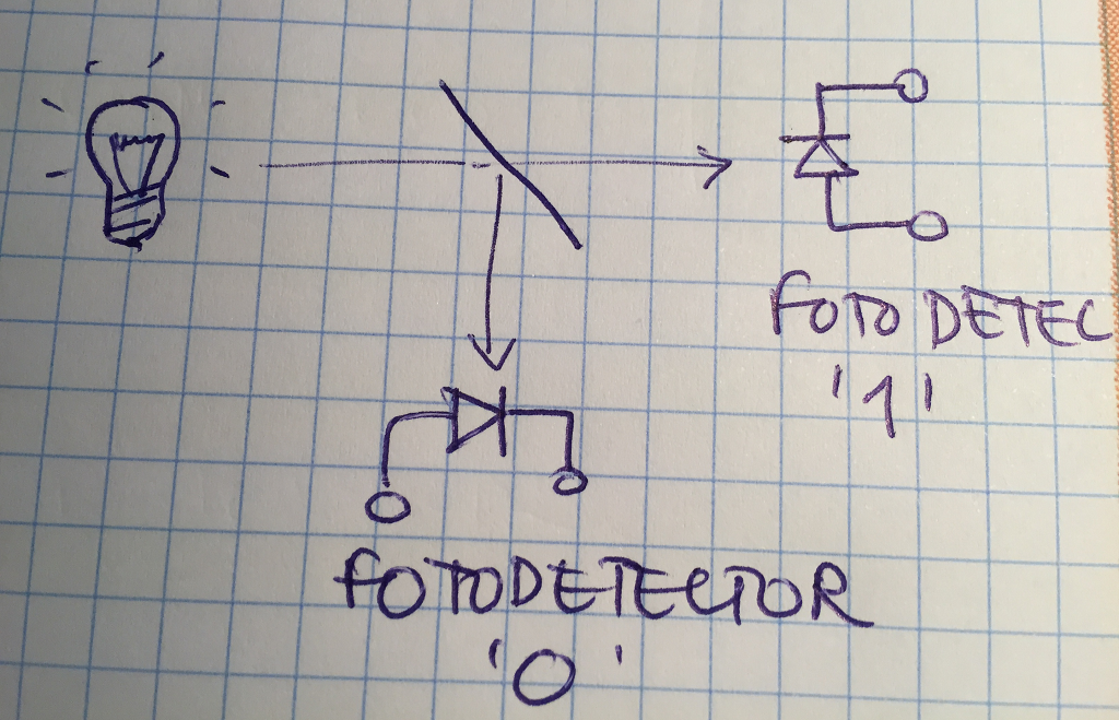 amb una font (tènue) apuntem a un mirall semireflectant; dos fotodetectors detecten un o l'altre el fotó de forma totalment aleatòria