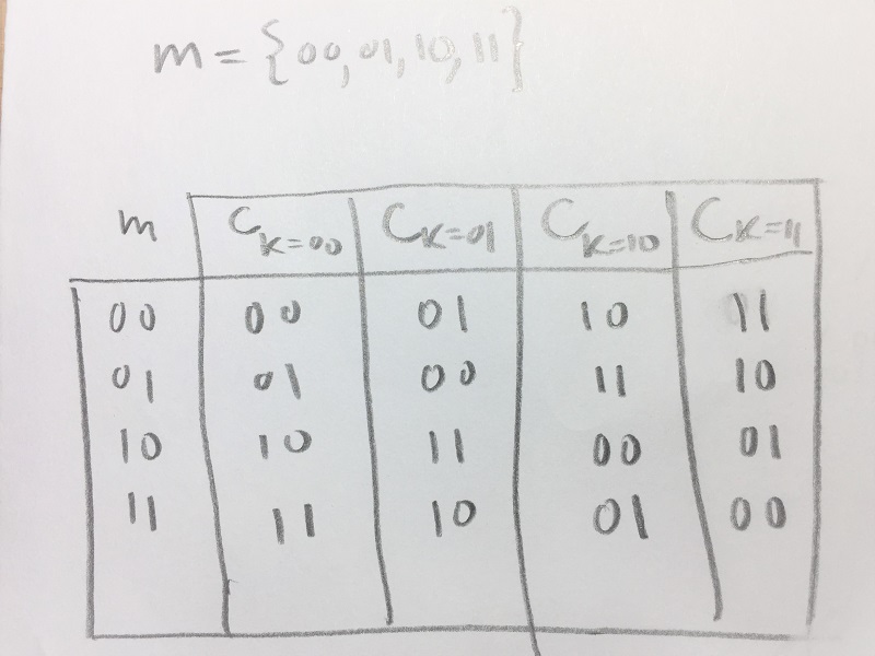 Tots els missatges de $2$ bit xifrats amb totes les claus possibles: